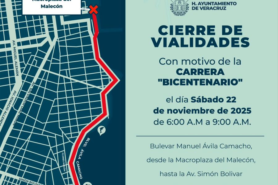 A través de un comunicado, el Ayuntamiento de Veracruz informó que el próximo sábado 22 de noviembre el bulevar Manuel Ávila Camacho permanecerá cerrado de 6:00 a 9:00 horas debido a la realización de la Carrera del Bicentenario.